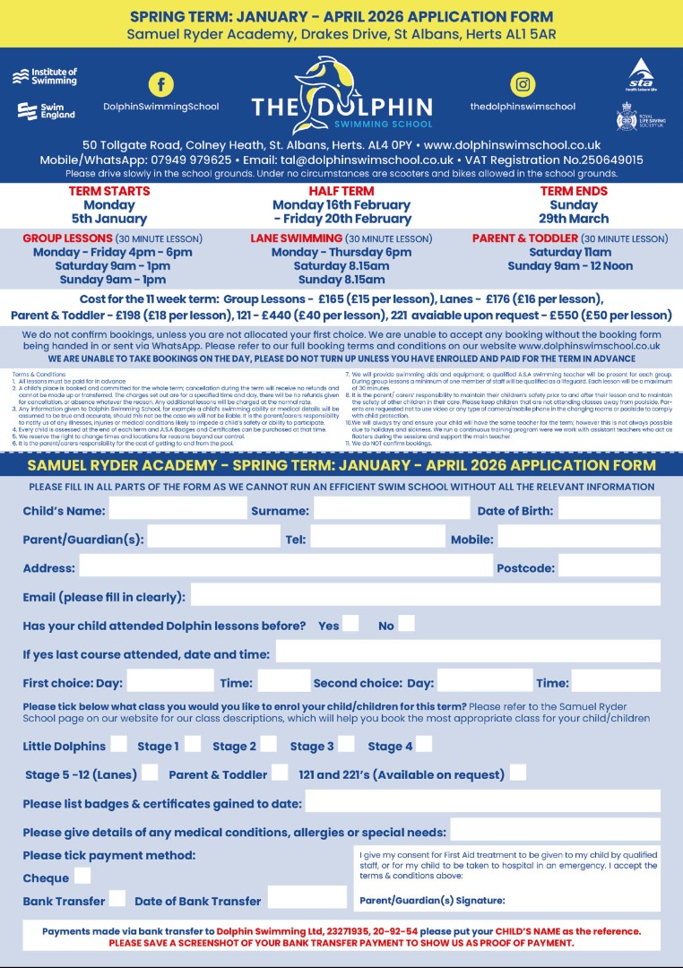 Any information given to Dolphin Swimming School, for example a child’s swimming ability or medical details will be assumed to be true and accurate, should this not be the case we will not be liable. It is the parent/carers responsibility to notify us of any illnesses, injuries or medical conditions likely to impede a child’s safety or ability to participate.